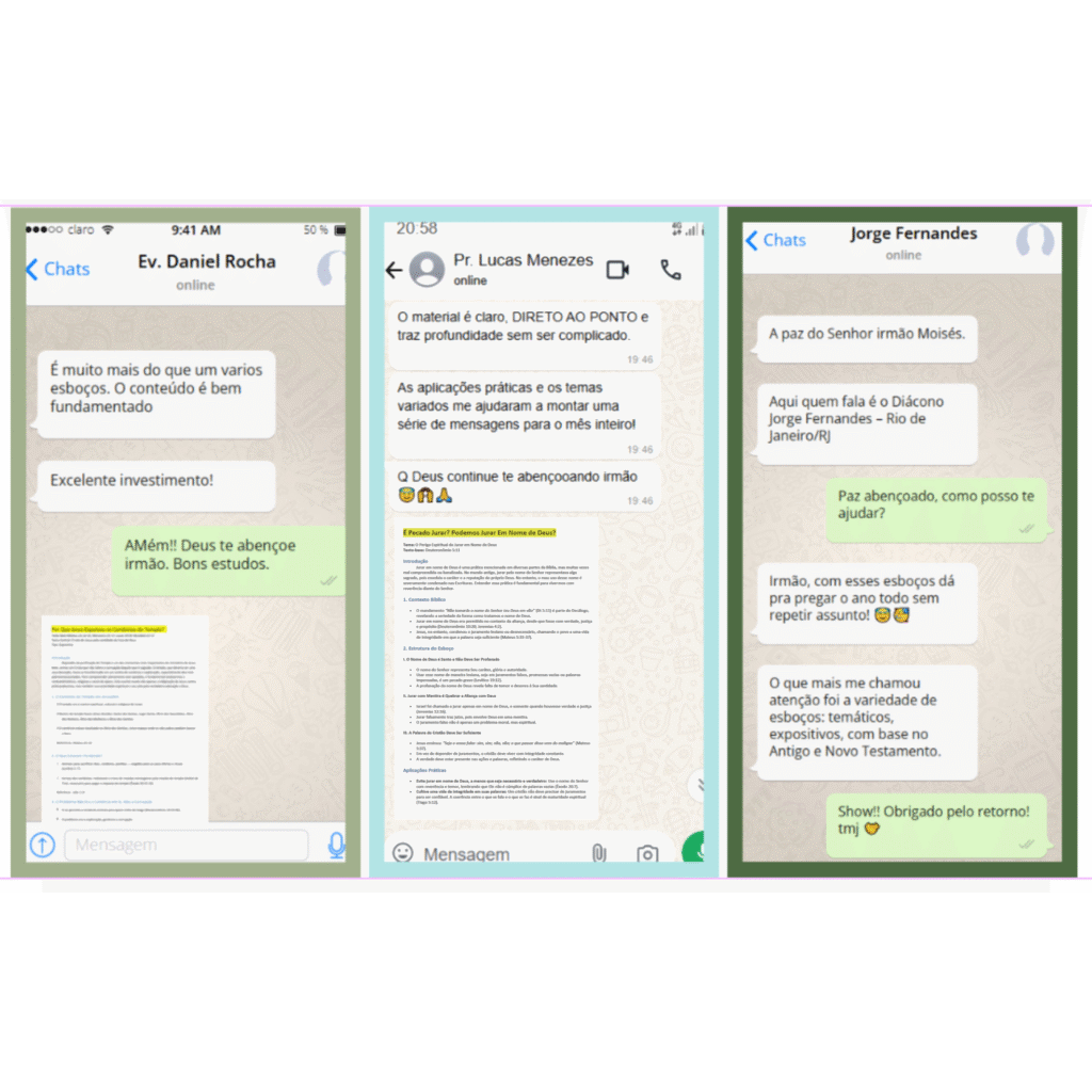 Neste material, você encontrará centenas de esboços temáticos, textuais e expositivos, todos cuidadosamente estruturados com aplicações práticas, contexto bíblico e visão teológica sólida. É o recurso ideal para quem quer pregar com mais autoridade, edificar vidas e nunca mais ficar sem direção na hora de preparar uma mensagem.